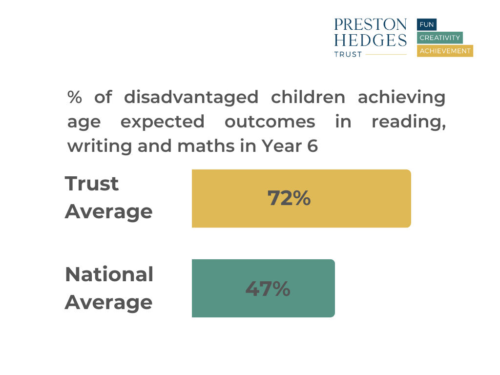 % of disadvantaged children achieving age expected outcomes in reading, writing and maths in Year 6 National 47% Trust 72%.